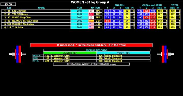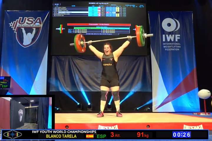 La atleta gallega alzó 91 kilos en arrancada, 112 en dos tiempos sumando 203 en total olímpico que le dieron la medalla de oro en todas las tres modalidades estableciendo records de España en dos tiempos y en el total Olímpico